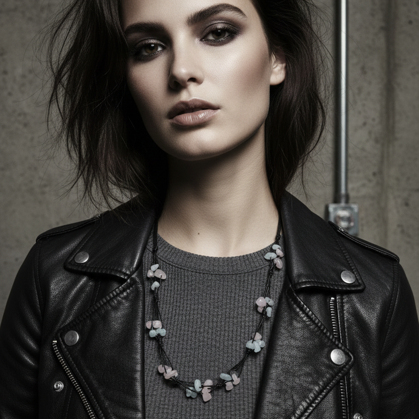 Brighten up your look with this quirky, handmade Beaded Necklace with Aquamarine and Rose Quartz. Features aquamarine and rose quartz chips on a black thread for a romantic bohemian touch.