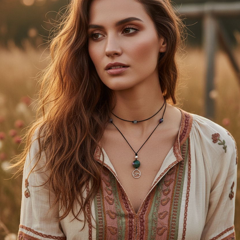 Enhance your boho style with this Black Thread Choker Necklace with Green and Pink Agate, featuring stunning natural stones beads and a delicate, silver plated wave charm. Hand-crafted with precision, this necklace provides a unique and elegant touch to any outfit.