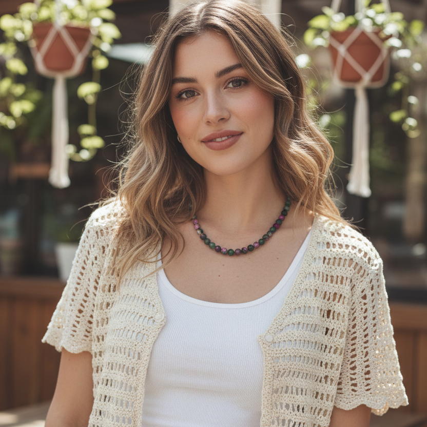 Pink and Green Agate & 925 Silver Beaded Necklace